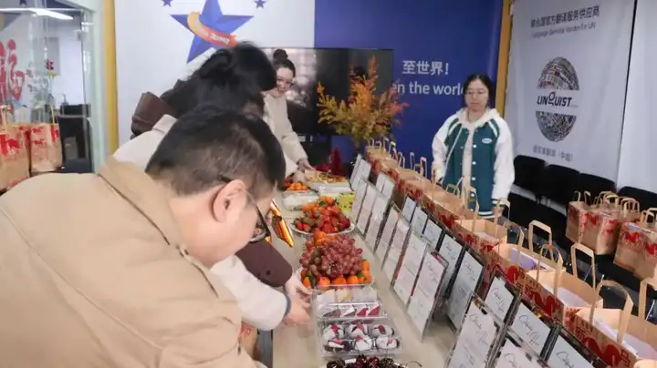 下午两点,年会在一片暖意融融中拉开序幕。茶歇区早已备好精致的点心、水果与热饮,伴随着轻松喜庆的新春乐曲,同事们陆续到来,取一杯热饮,品一口甜点,在悠闲的氛围中自由交谈。忙碌一年的身心在此刻缓缓舒展,笑语与寒暄声交织,属于语言家“大家庭”的温暖,正悄然弥漫。